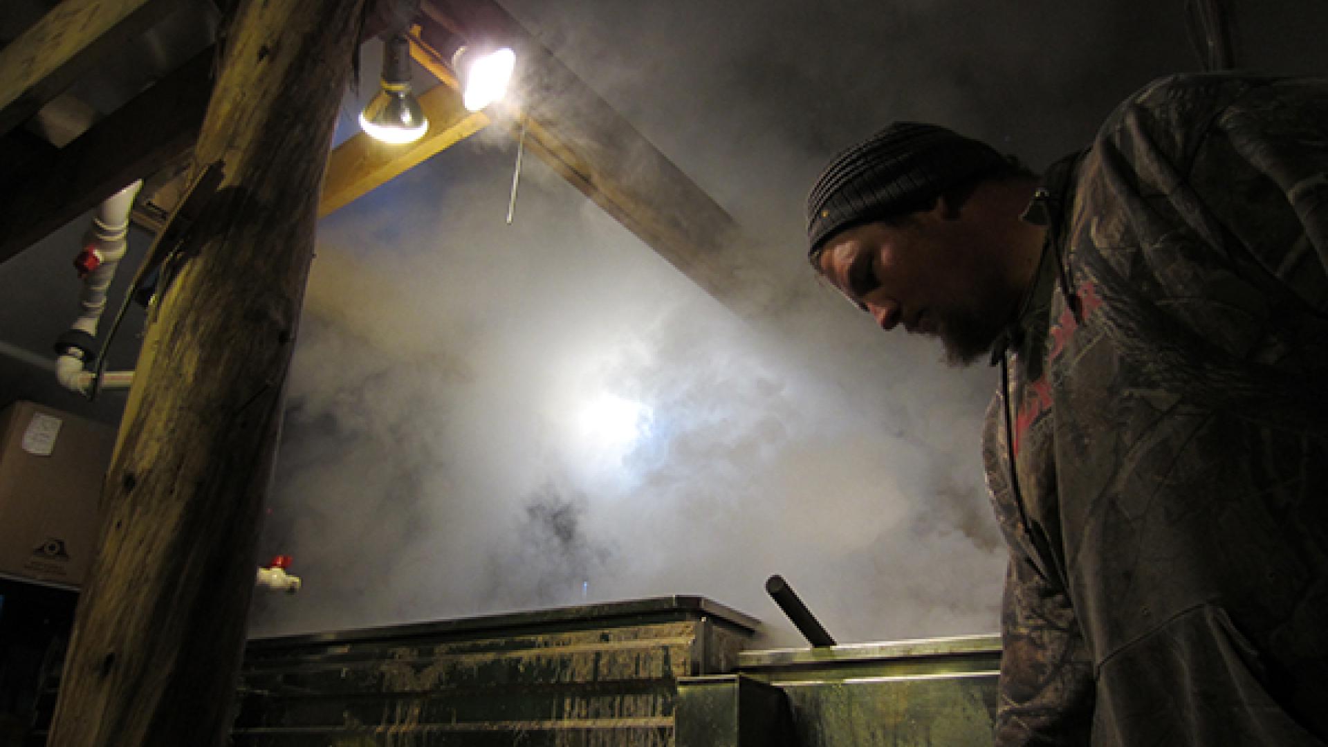 Steam! In the coldness of the sugar shack the first plume of steam is a welcome sign.