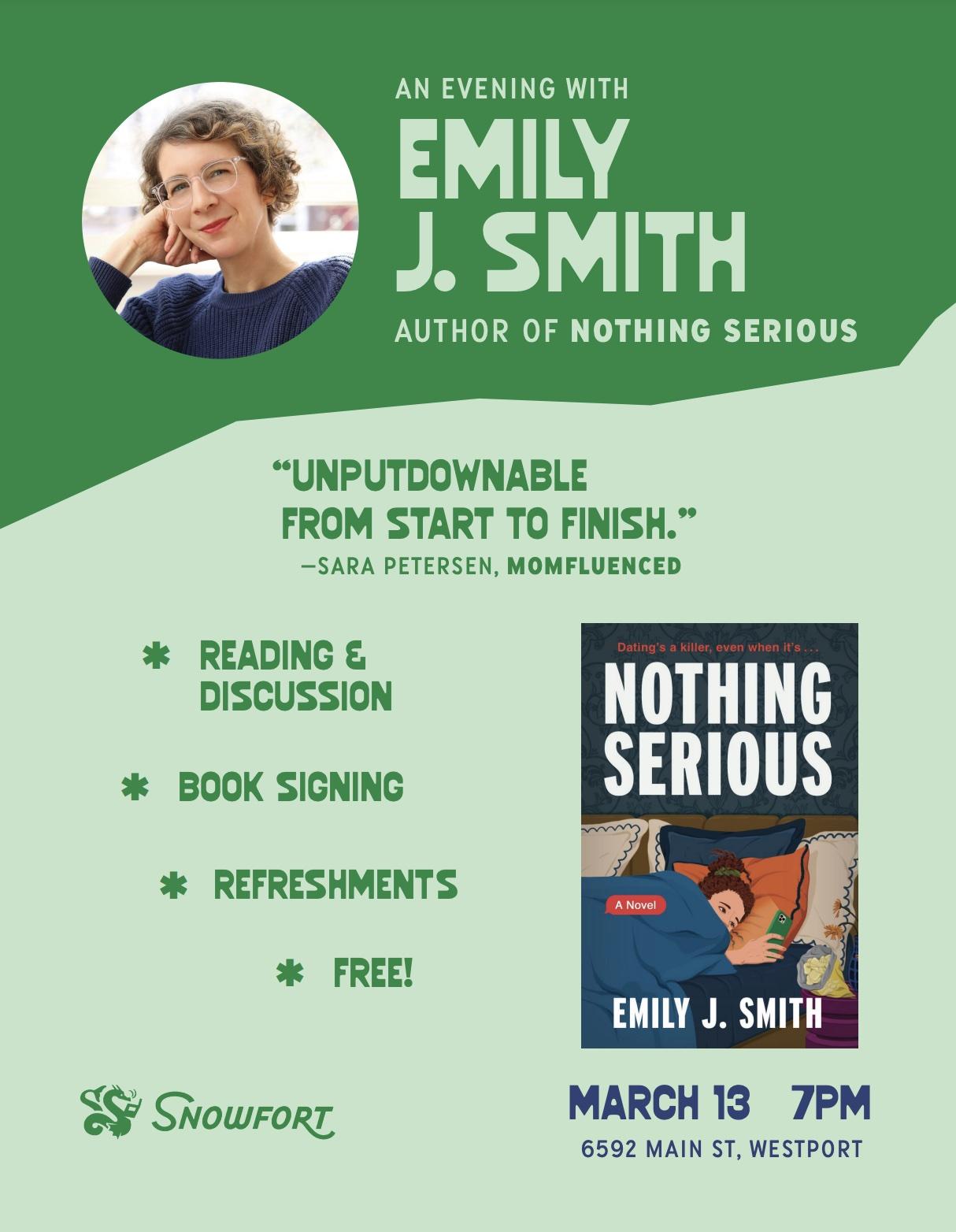 Come celebrate the book launch Nothing Serious by Emily J. Smith at Snowfort Books! The author will sign copies and read from her witty dating world thriller that's been hailed as "unputdownable from start to finish" and "deeply relatable." Enjoy refreshments and literary merriment at this free event!