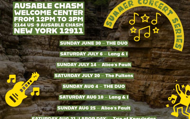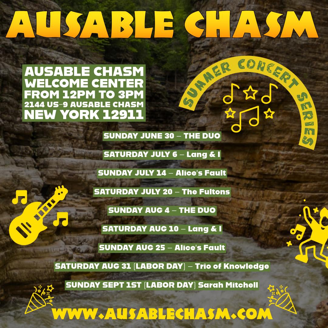 Ausable Chasm Summer concert series kicks off Saturday June 30th from 12pm to 3pm. Join us on our Welcome Center deck/concert lawn overlooking Rainbow Falls for a festive treat. Great music, great food and lots of company! All concerts are free and open to the public.