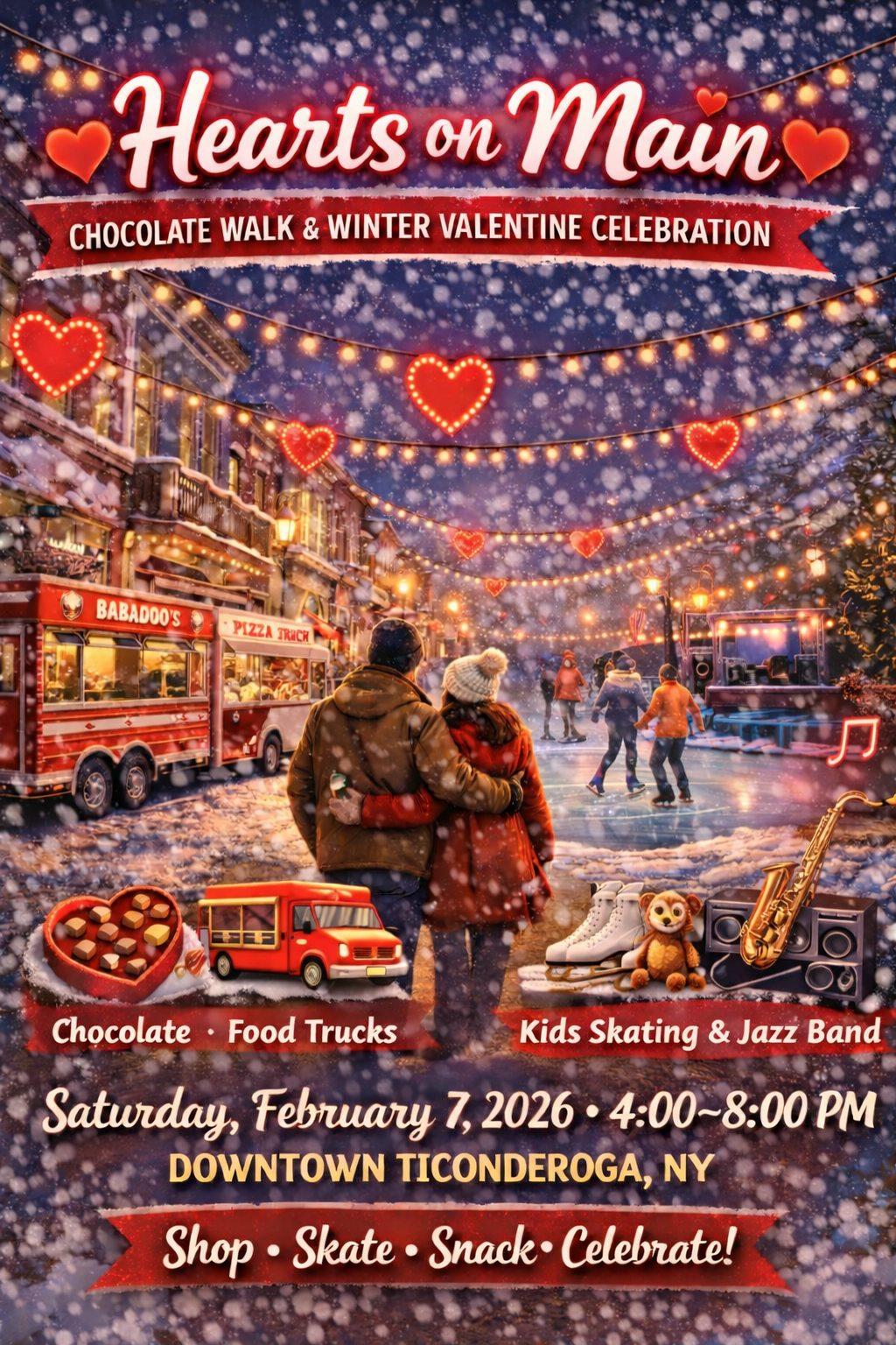 A cozy indoor Valentine's celebration focused on local love and handmade gifts, art, florals, candles, sweets and specialty treats perfect for Valentine's shoppers. Bundle up and join us for a cozy winter night on Main Street! Hearts on Main is a free, family-friendly Valentine celebration featuring sweet treats, skating, music, and fun for all ages!