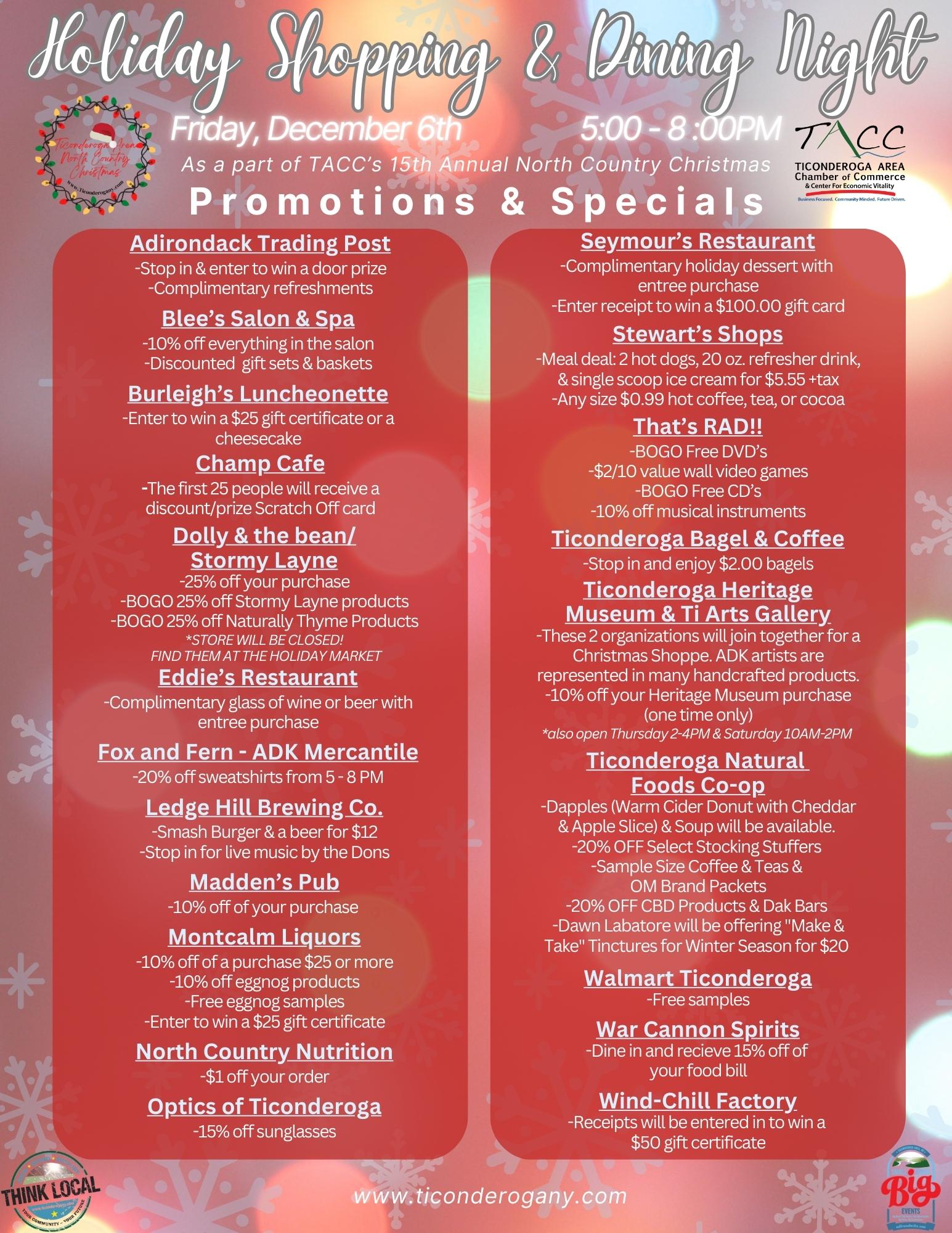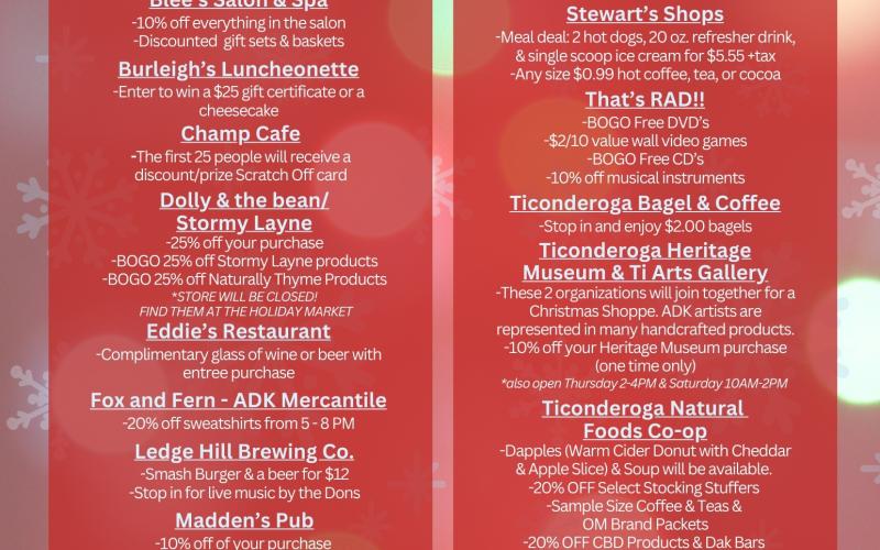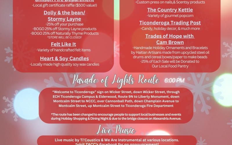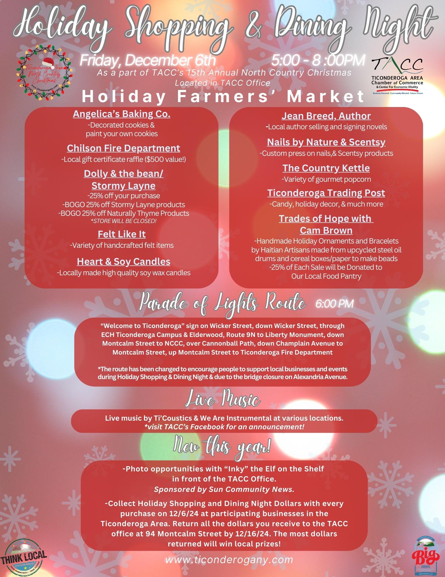 Your opportunities to THINK LOCAL and celebrate the holidays continue! Mark your calendars for Friday, December 6th, 2024 from 5:00-8:00 PM for Holiday Shopping & Dining Night/Holiday Market/Parade of Lights! All of this is part of the Ticonderoga Area North Country Christmas which runs November 30th through December 8th!