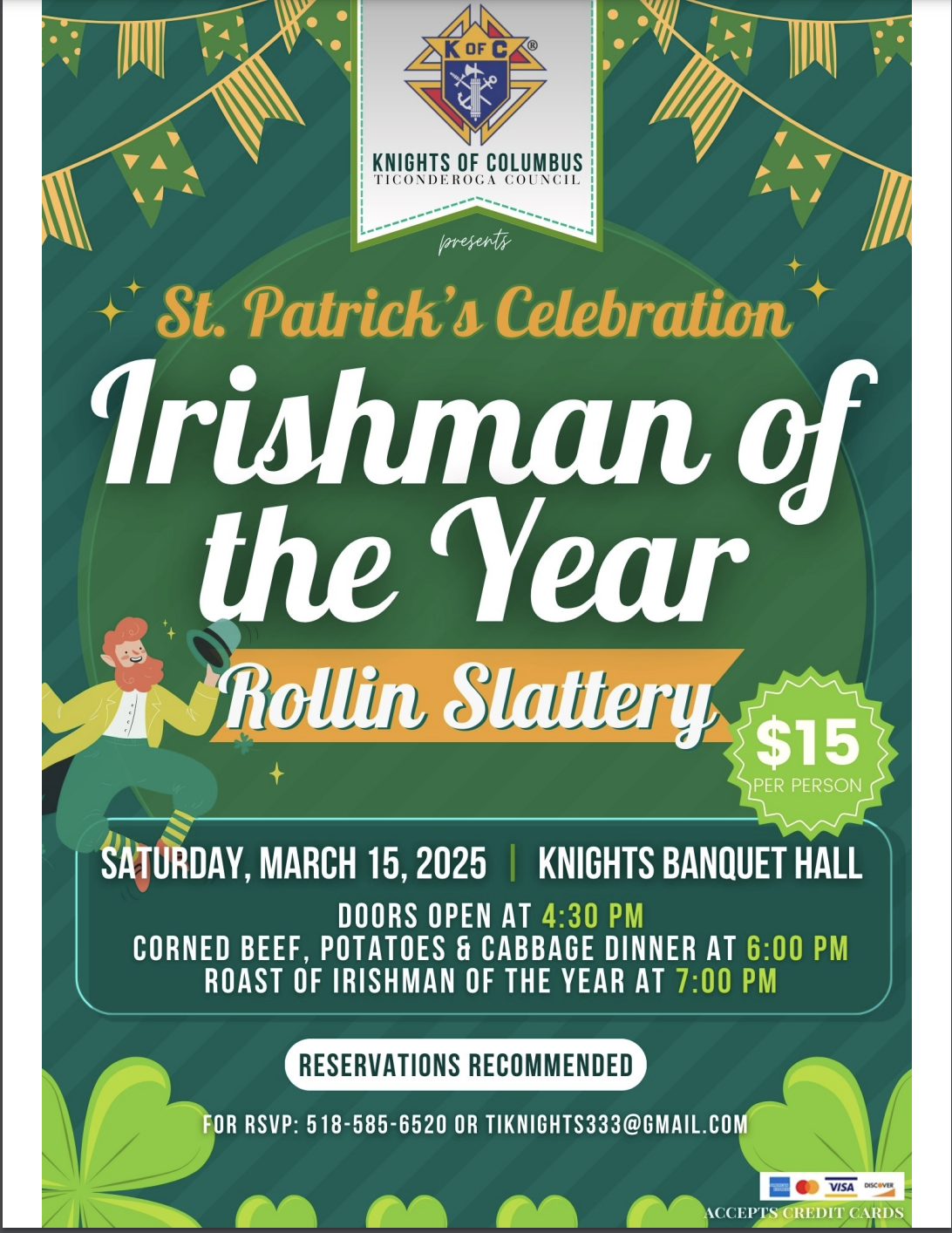 Get ready to celebrate this year's Irishman of the Year with a fun-filled roast! Join us on Saturday, March 15, 2025, at the Knights Banquet Hall - Ticonderoga.