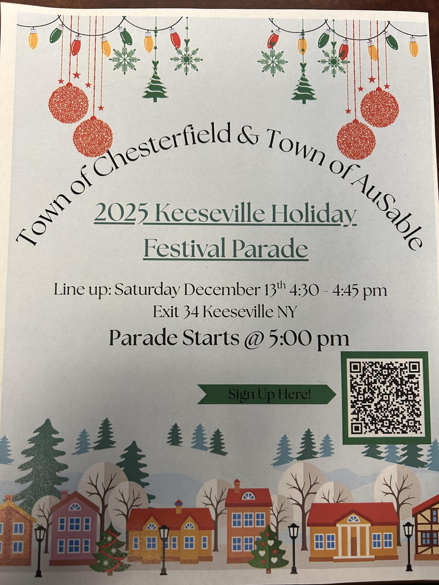 Mark your calendars!! Saturday, December 13th is the Keeseville Holiday Celebration with entertainment, the children’s store, refreshments and , of course, the big big parade at 5 !!