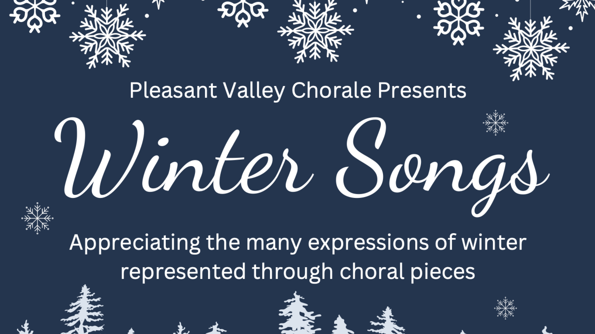 The Pleasant Valley Chorale winter program "Winter Songs" features choral pieces that  appreciate the many expressions of winter. Directed by Nora Nadire with Accompanist Kerry Mero.  Admission is free.  Donations accepted at the door.