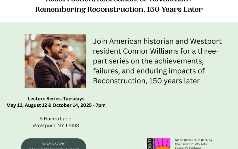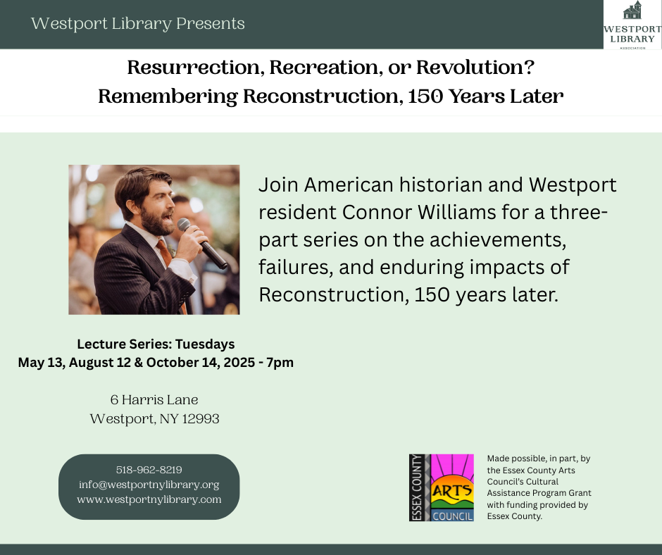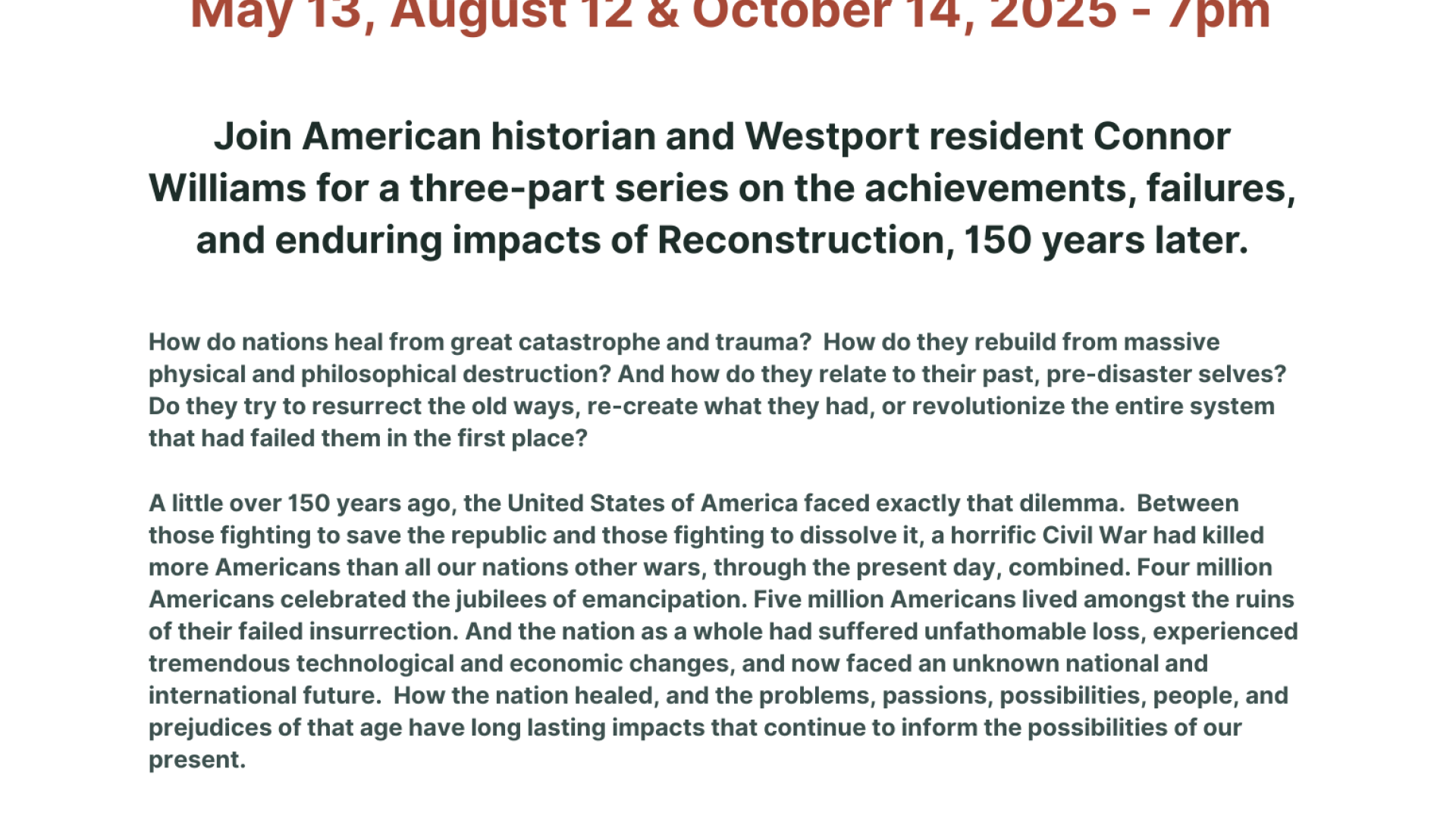 Join American historian and Westport resident, Connor Williams, for a three-part lecture series on the achievements, failures and enduring impacts of Reconstruction, 150 years later.