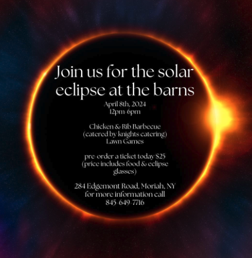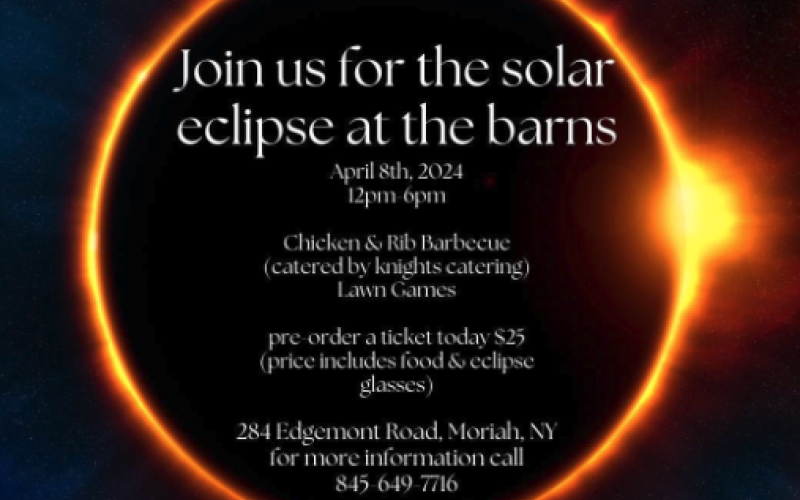 The Barns at Edgemont Inn, 284 Edgemont Road, Moriah, will be hosting a Chicken & Rib Barbecue on April 8 during the afternoon of the Solar Eclipse, from 12:00 pm until 6:00 pm. The barbecue will be catered by Knights Catering. Tickets are $25 and include food and eclipse glasses. Lawn games will also be featured. For tickets or more information call: 845-649-7716.