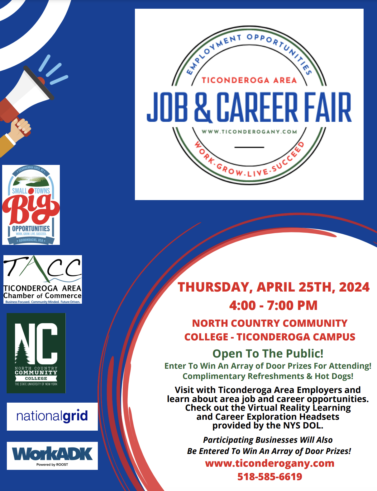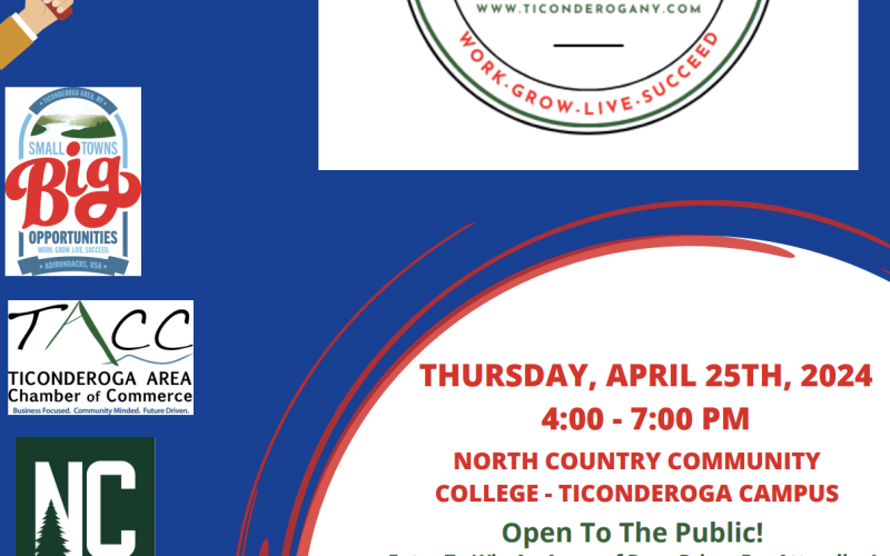 The Ticonderoga Area Chamber of Commerce (TACC) in coordination with North Country Community College will host the Ticonderoga Area Spring Job Career Fair on Thursday, April 25th, 2024 from 4:00 – 7:00 PM. The event will take place at the North Country Community College Ticonderoga Campus.