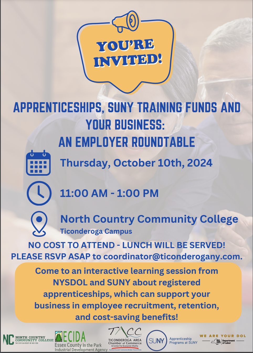 Ticonderoga Area businesses are invited to participate in this interactive learning session from the NYSDOL and SUNY about registered apprenticeships. This program can support your business with employee recruitment and retention as well as having cost-saving benefits.
