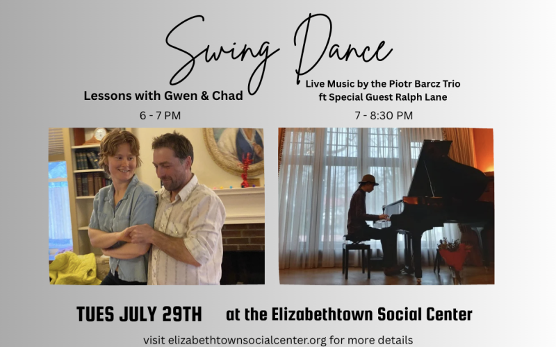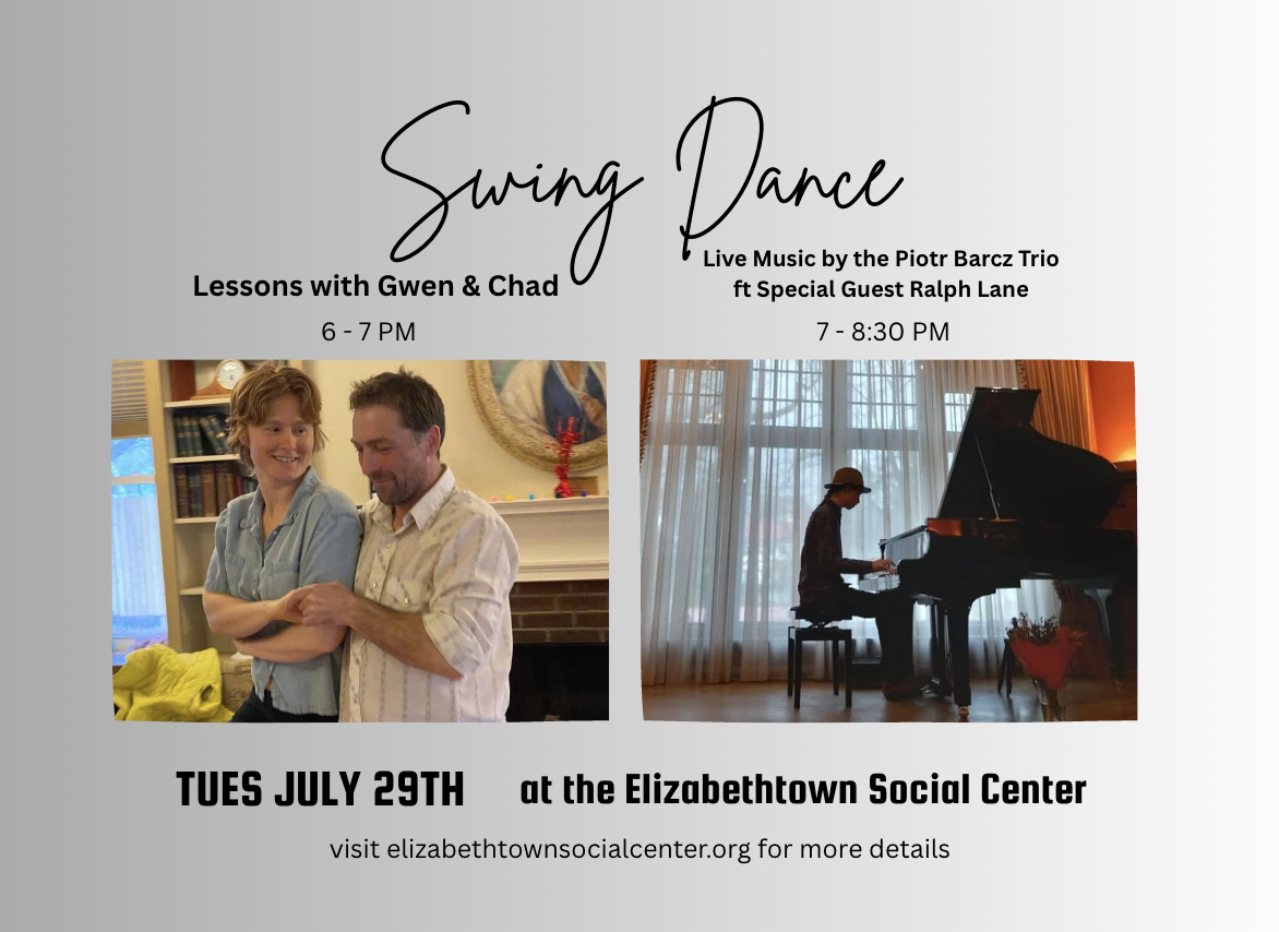 The Elizabethtown Social Center invites you to a lively evening of swing dancing for all ages, starting with a one-hour beginner-friendly East Coast Swing lesson led by dance instructors Chad and Gwen Vogel, followed by live music from the Piotr Barcz Trio with special guest Ralph Lane on guitar.