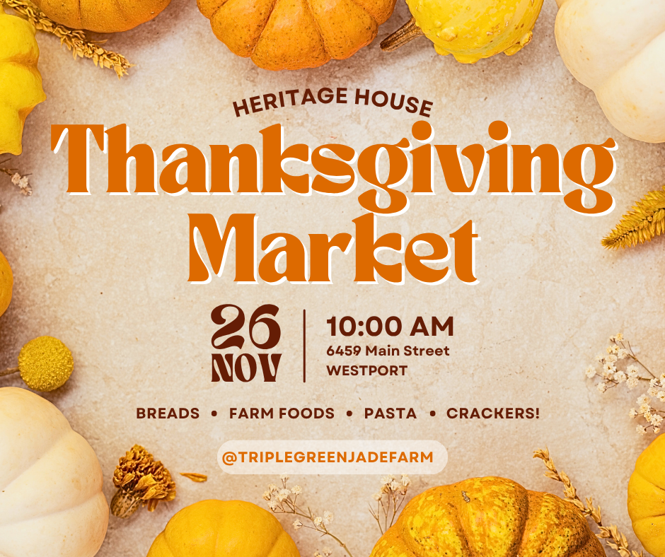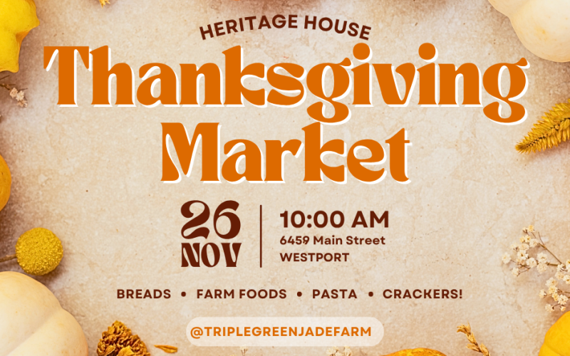 Stock up for Thanksgiving with fresh baked breads, cookies, pies, quiche, farm foods, pasta and even the return of Kimmy's Crackers! Westport Heritage House, November 26, 10:00 am -1:00 pm.
