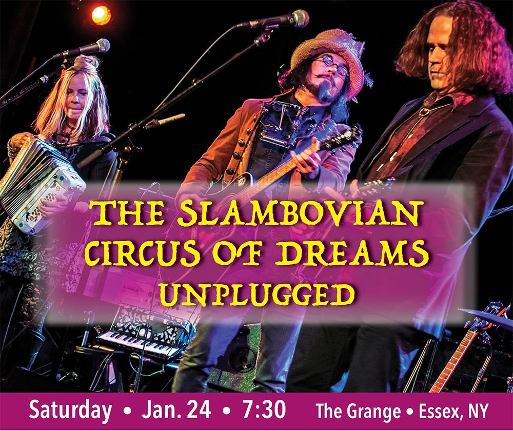 The Grange is thrilled to present one of the best live groups you’ll ever hear—or dance to! Come out for a magical night with The Slambovian Circus of Dreams Unplugged, a rare trio performance by founding members of the band. Take a peek behind the “Slambovian Curtain” and experience their deep connection with audiences and legendary live shows in this intimate performance. Charismatic frontman, Joziah presides center-ring with vocals, joined by bandmates Tink (accordion, cello, mandolin, flute), and the guitar-slinging skills of Sharkey McEwen. Bring your friends and celebrate a new year, Slambovian-style!