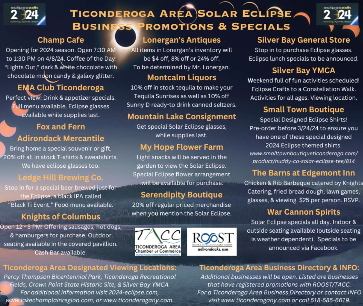 Check out the solar eclipse promotions and events happening in the Ticonderoga Area!