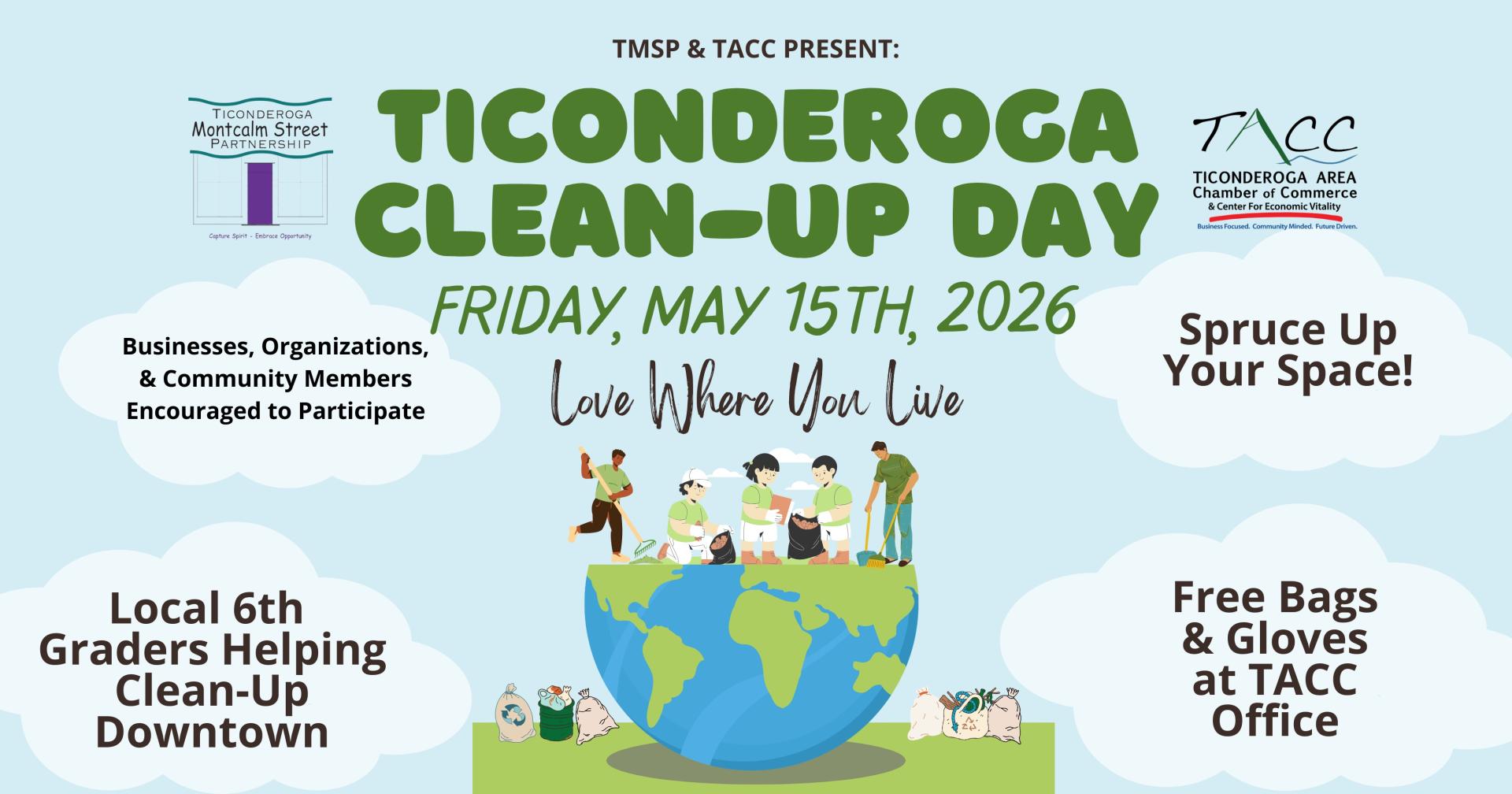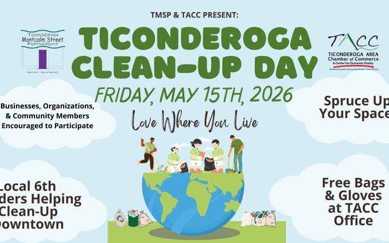 The Ticonderoga Montcalm Street Partnership (TMSP), with support from the Ticonderoga Area Chamber of Commerce (TACC), is excited to announce Ticonderoga Clean-Up Day taking place on Friday, May 15th, 2026 in Ticonderoga.
