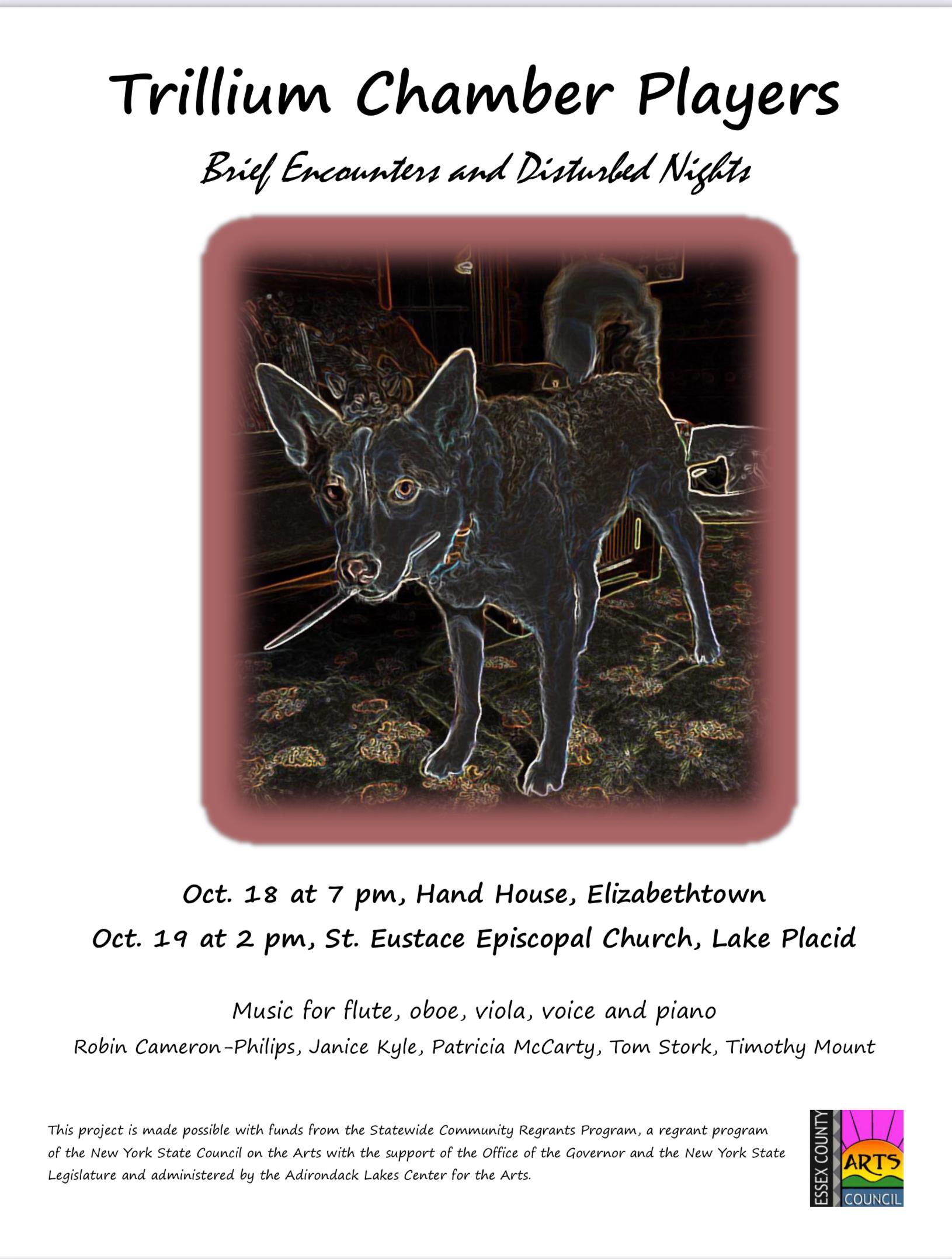 There is so much contrast in this program of short delights, we had to design two different flyers. On the one hand are several unusual works including Tarantula for solo viola; Disturbed Nights by John Hawkins, a set of variations inspired by a “mildly disturbing picture;” and an oboe-viola duet entitled Brief Encounters. On the other hand is a lighthearted trio by Pucihar; selections from Aaron Copland’s Old American Songs for voice and piano; and Schoenfield’s heartfelt prayer, Achat Sha’alti for flute and piano.