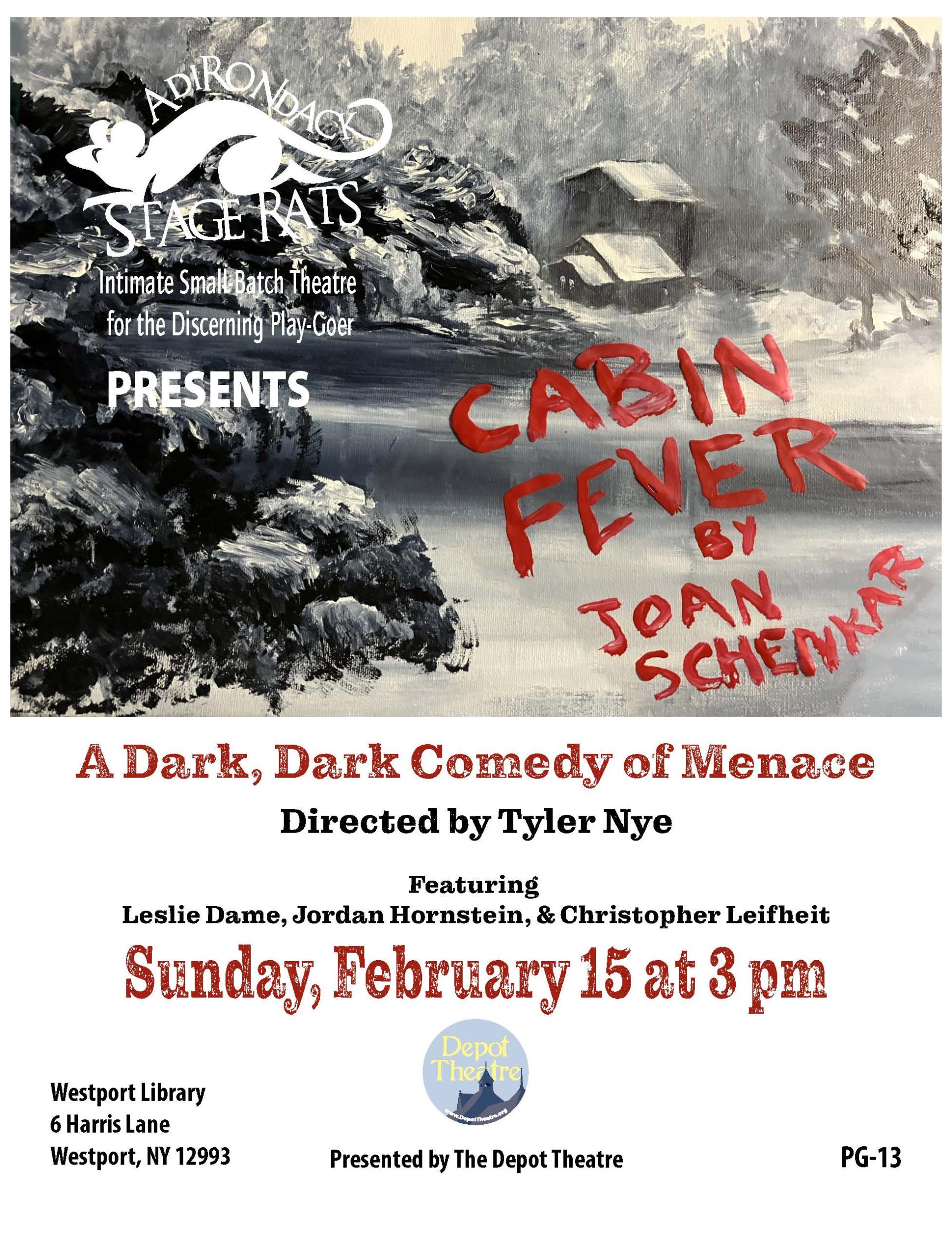 Sunday February 15 at 3P Adirondack Stage Rats (Intimate Small Batch Theatre for the Discerning Play-Goer) and Depot Theatre present Cabin Fever by Joan Schenakar, A Dark, Dark Comedy directed by Tyler Nye and featuring Leslie Dame, Jordan Hornstein & Christopher Leifheit.