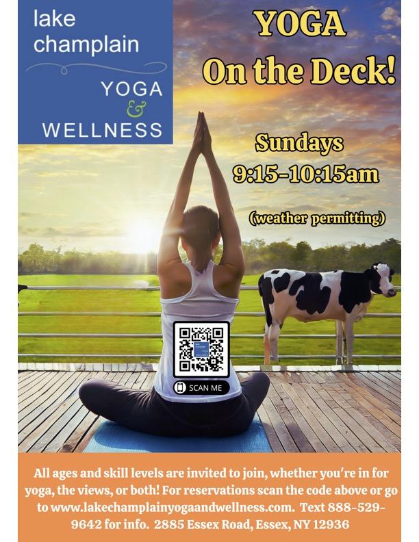 Join Lake Champlain Yoga & Wellness each Sunday, 9:15-10:15 am for Yoga on the Deck! Our deck overlooks bucolic farmland fields where you may see cows, sheep, chickens, and other wildlife. All levels and ages are welcome. After class, take a jaunt into Essex for a bite to eat. Our town is on the National Historic Register and has cute cafes, art galleries, and boutiques. For info and reservations, go to our website; www.lakechamplainyogaandwellness.com or text 888-529-9642.