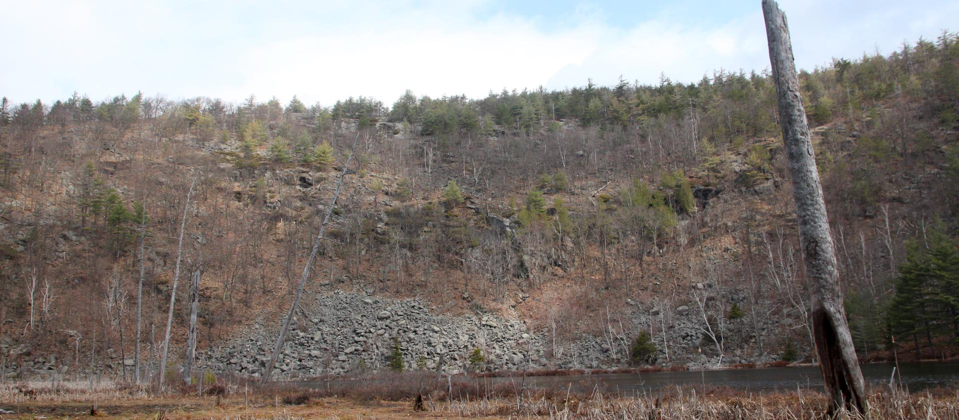 The mountain you will be hiking near is private property, do not be tempted by the prospect of good views to trespass. You will come out to the southern shore of the pond; the cliffs of Skiff Mountain are seen opposite of you. Herd paths do go around the pond in parts to give different perspectives of this body of water.