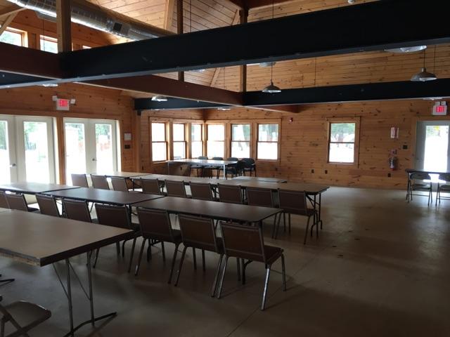 The Lodge offers just over 1800 sq. ft. of space which includes a full kitchen, two bathrooms, and a small accessory room. The kitchen's counter top window offers a convenient place for a bar station, and the smooth floor surface provides an excellent space for a dance floor. French doors, which lead to an outdoor patio, allow for expansion into a tent or open-space.