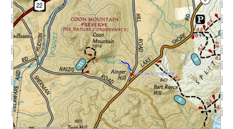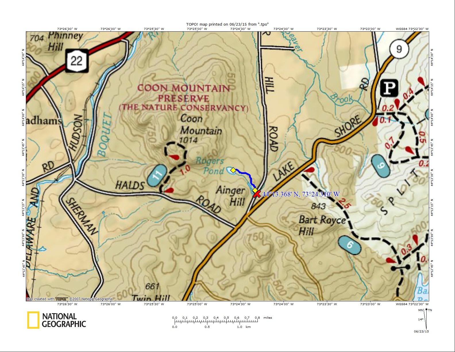 From the road look for a path on the north side of the outlet and follow it. There will be camp to your right, avoid the camp. The path will lead you along the shore and back to Roger Pond. Ainger Hill sits above the pond to the back.