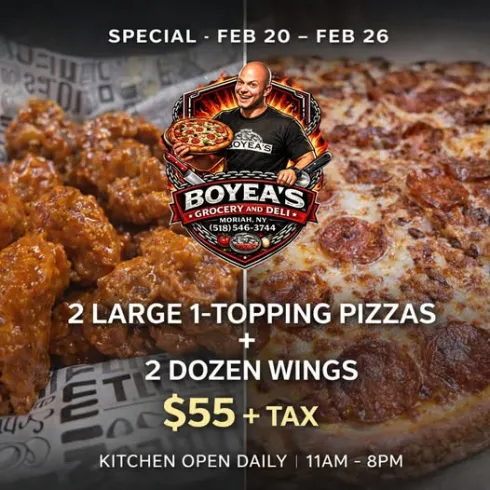 Enjoy a delicious family feast with this week’s special at Boyea’s Grocery and Deli in Moriah. From February 20 through February 26, get two large one-topping pizzas plus two dozen wings for just $55 plus tax. Perfect for game night, gatherings, or an easy dinner everyone will love.