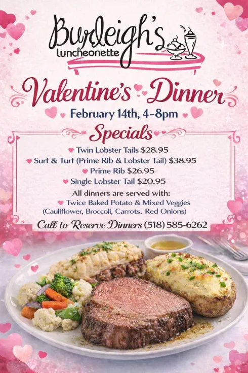 Looking for a place to take your sweetheart? Check out our Valentine's Day dinner specials! Our regular menu is also available. Give us a call to reserve your dinner choice 518-585-6262!