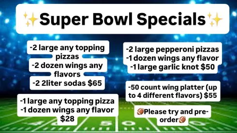 Hosting a crowd or keeping it simple? We’ve got your Super Bowl spread covered. Choose from our game-day combos featuring large pizzas, wings in any flavor, garlic knots, and soda, or go big with a 50-count wing platter with up to four different flavors.