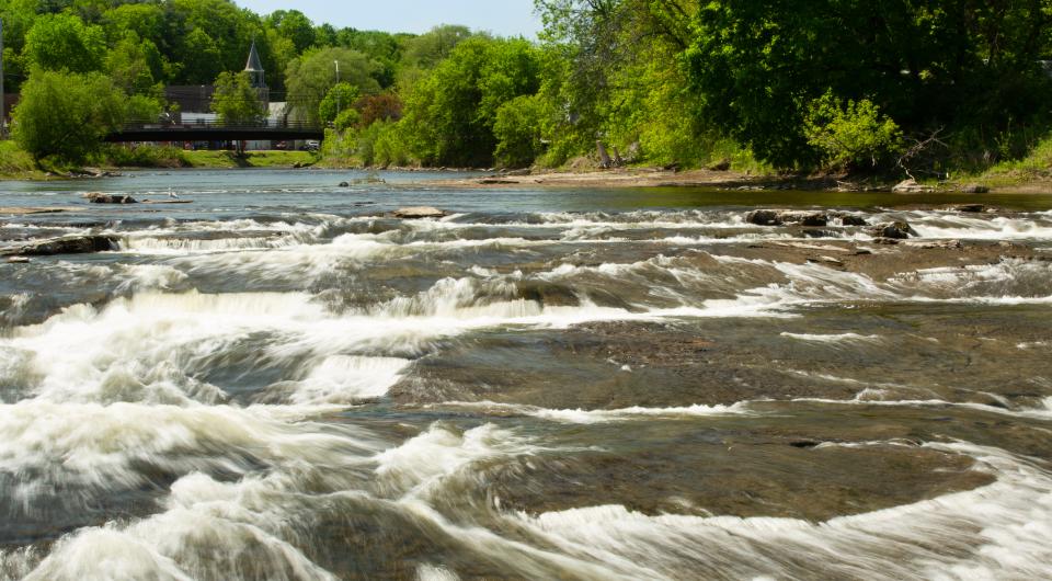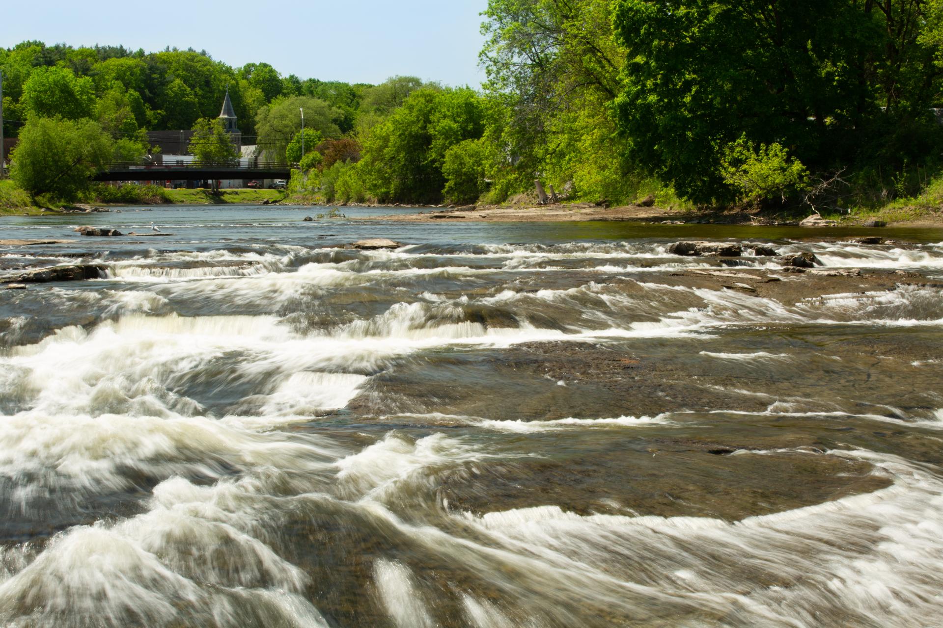 The Northway to Boquet section of the Boquet River sweeps under quaint bridges and features beautiful farmland views with distant mountains as a backdrop.