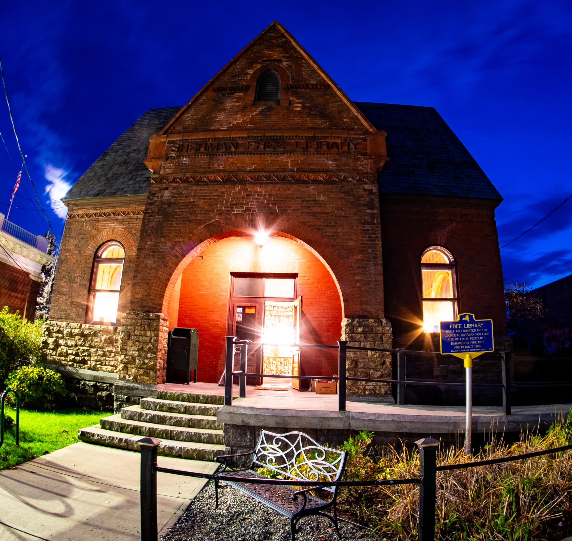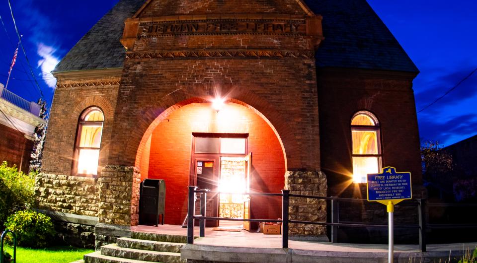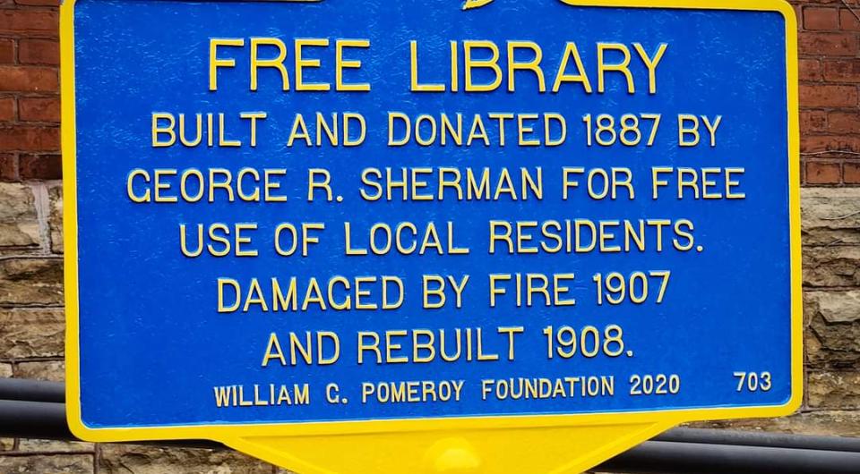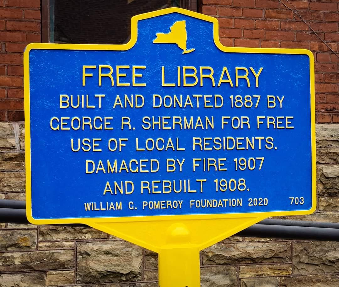 The Sherman Free Library opened on January 17, 1887. Mr. George Riley Sherman, partner in the Witherbee & Sherman Mining company, provided funding to build the library and stock it with 3,000 volumes. He stipulated that the library would be free to every person residing within the village limits.