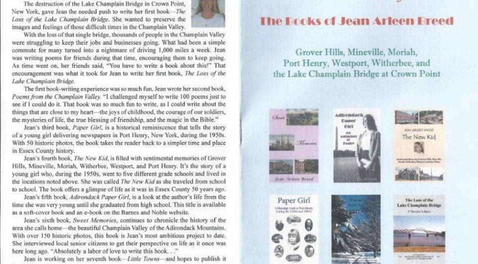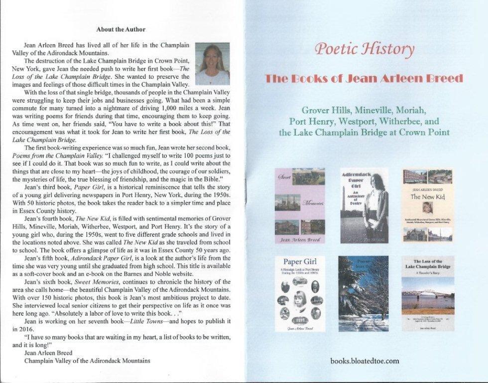 The destruction of the Lake Champlain Bridge in Crown Point, NY, gave Jean the needed push to write her first book - The Loss of the Lake Champlain Bridge. She wanted to preserve the images and feelings of those difficult times in the Champlain Valley.