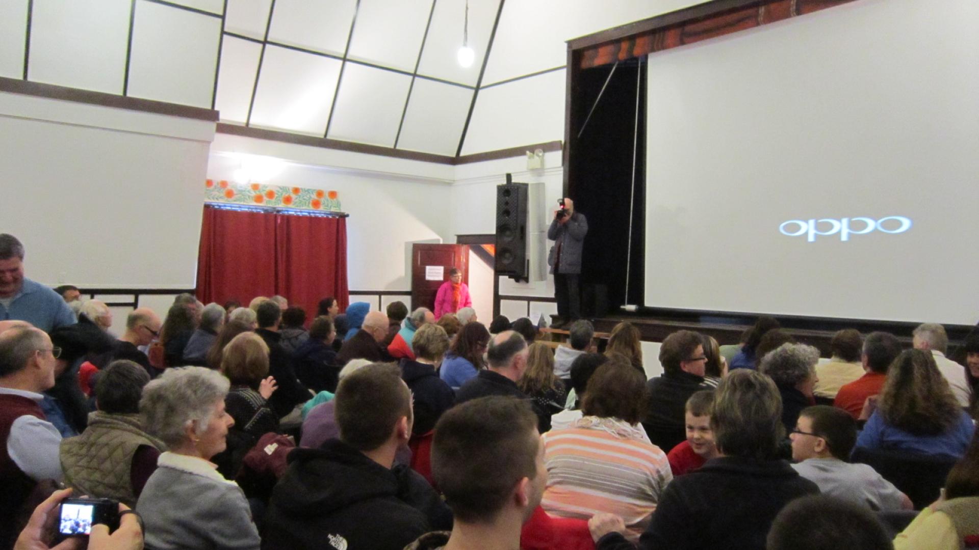 Beginning in early in the year, The Champlain Valley Film Society offers films at The Whallonsburg Grange every other Saturday at 7:30. This organization brings fabulous opportunities to us to see current and classic first class films. Often the movies are accompanied by a guest speaker or renowned interpreter to enhance the “movie going experience”. Early birds were fortunate last weekend to get in to meet and hear from Captain Richard Phillips himself and watch the movie nominated for four Academy Awards. Understandably, the building had reached its capacity when I arrived a mere 45 minutes early. What was I thinking? I did get a picture of the Captain’s back however as he arrived and met with the Program Manager, Mary- Nell Bockman. Ah well.