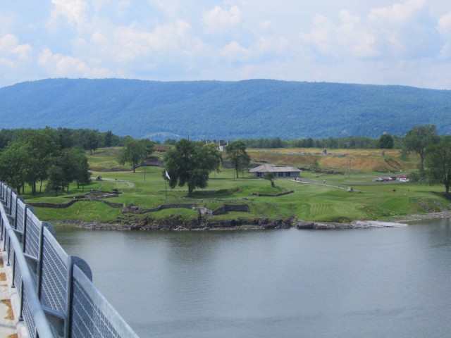 Looking straight ahead as you descend from the arch will give you a phenomenal overview of the Crown Point State Historic Site and its two National Historic Landmarks. The distant stone chimneys and waving British flag (during summer months) indicate the ruins of His Majesty’s Fort at Crown Point, and in the foreground lies the stonework foundation of Fort St. Frederic. Near this foundation, you will see France’s solid white naval flag of that era. Make another mental note to visit CPSHS’s museum to catch the audio-visual show explaining the occupation of these two forts and the significance of this piece of geography. Look for fishermen off the rocky ledges along the site’s shoreline or off Arrowhead Point, the long, narrow peninsula protruding north into the water.