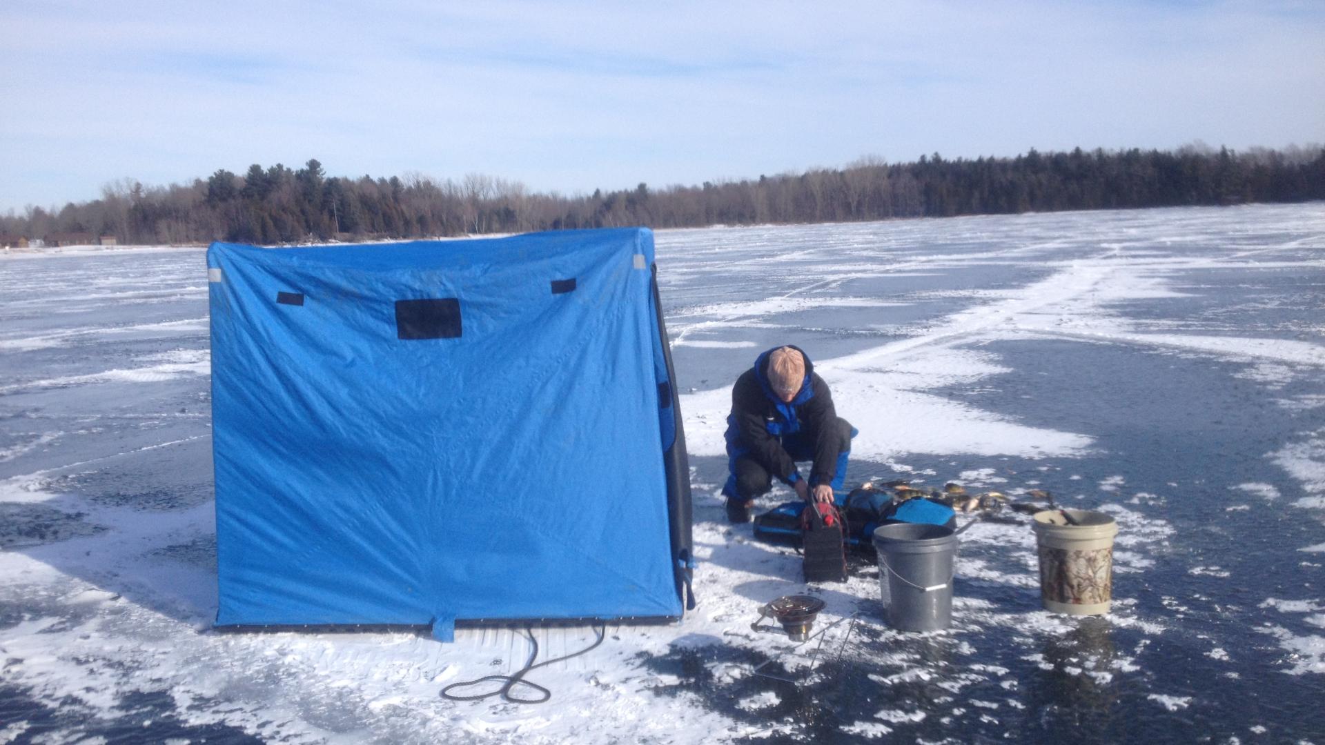 Bryce dismantled the bundled gear on top of the sled, including a hand ice auger. He made quick work of drilling two 5 inch diameter holes through what seemed to be about 8-10 inches of ice. He then converted the “sled” into a shanty by moving a couple of aluminum tubes inside, and moved the whole thing over the holes.