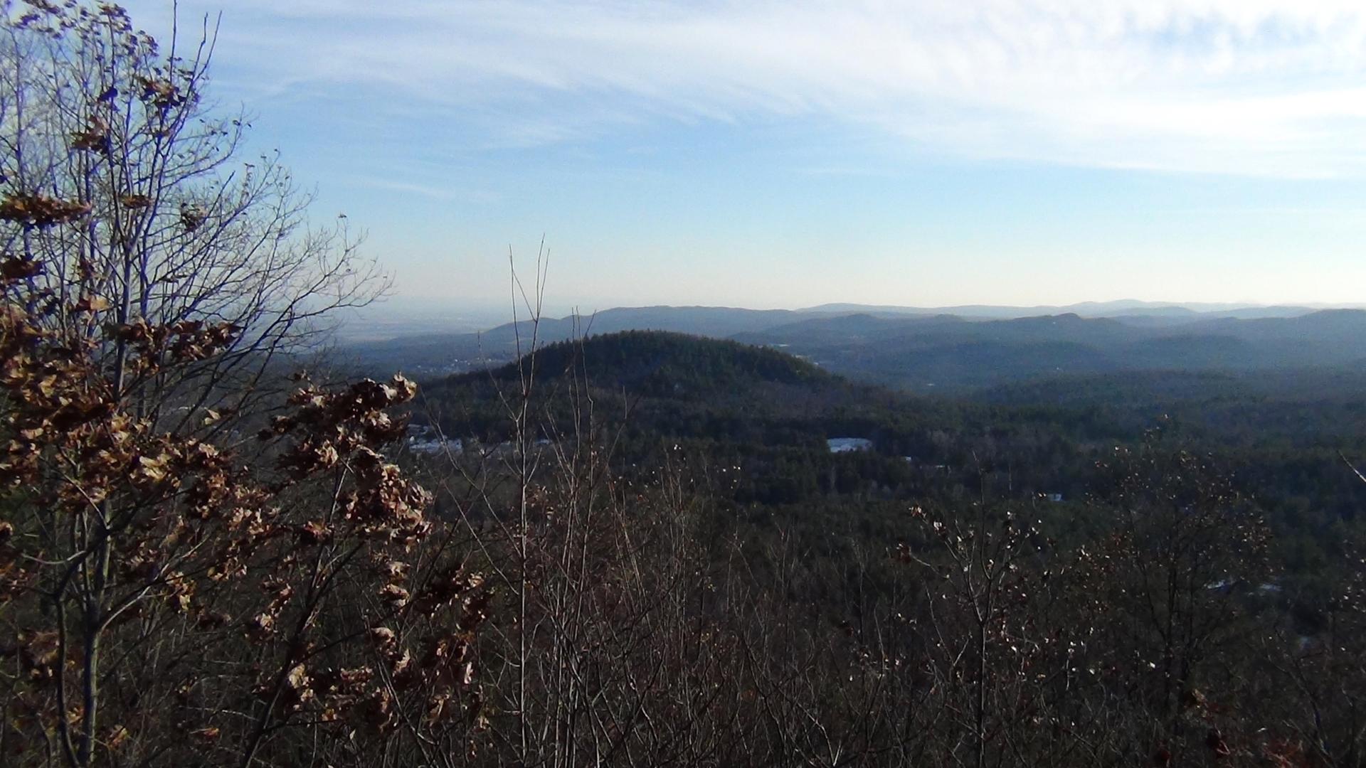 My companion and I are warmly dressed, because it is a chilly, but bright, day. Throughout the trail, we have set a brisk pace and both of us drop our headgear. Gloves, not mittens, are perfecty adequate. But once we reach the summit, that will change. The trail was still, with woods on both sides sheltering us. At the top, there is wind, and the well-known chill factor.